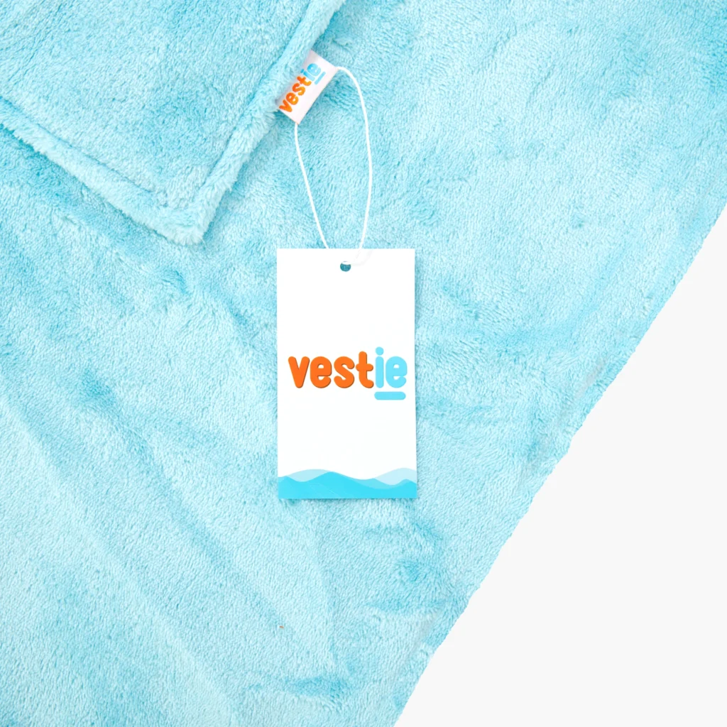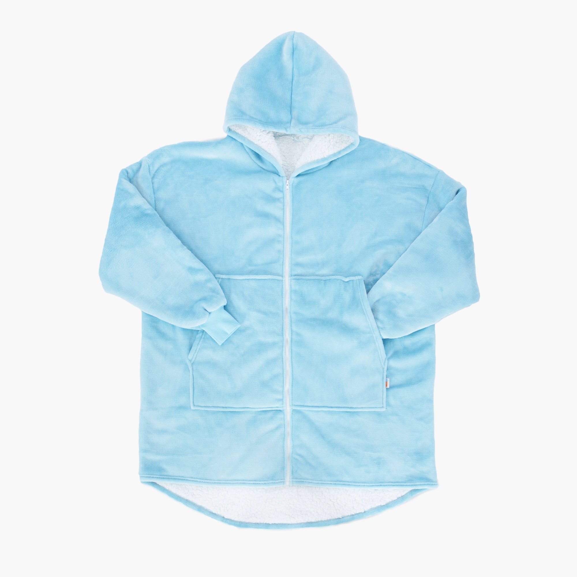 This is the Blue Vestie; one of Vestie’s originals. It is our special oversized wearable blanket with zipper in the color light blue.